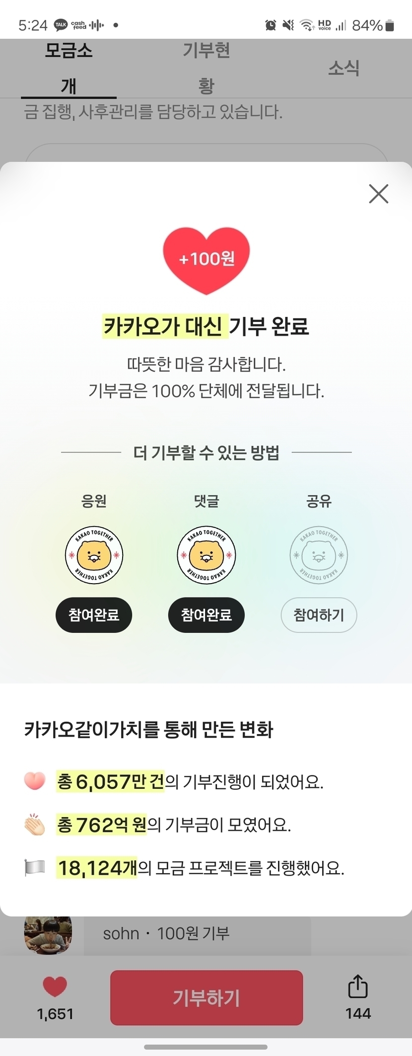 24.08.28 109 읽음 [소개] 카카오 같이가치 기부활동 행복한족제비 구독하기 3 6 콘텐츠의 수익 3 카카오에 이런 기능이 있었네요같이가치 탭에서 각종 기부 활동을 보고 기부도 진행할 수 있는데,좋아요와 댓글만 작성해도 카카오에서 대신 기부금이 들어간다고 합니당다들 한번씩 둘러보시면 좋을 것 같아용https://together.kakao.com/fundraisings/119970/story 6 0 / 300 입력