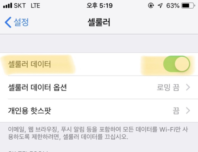 2. 셀룰러 켜져있는지 체크(꺼지면 안됨)