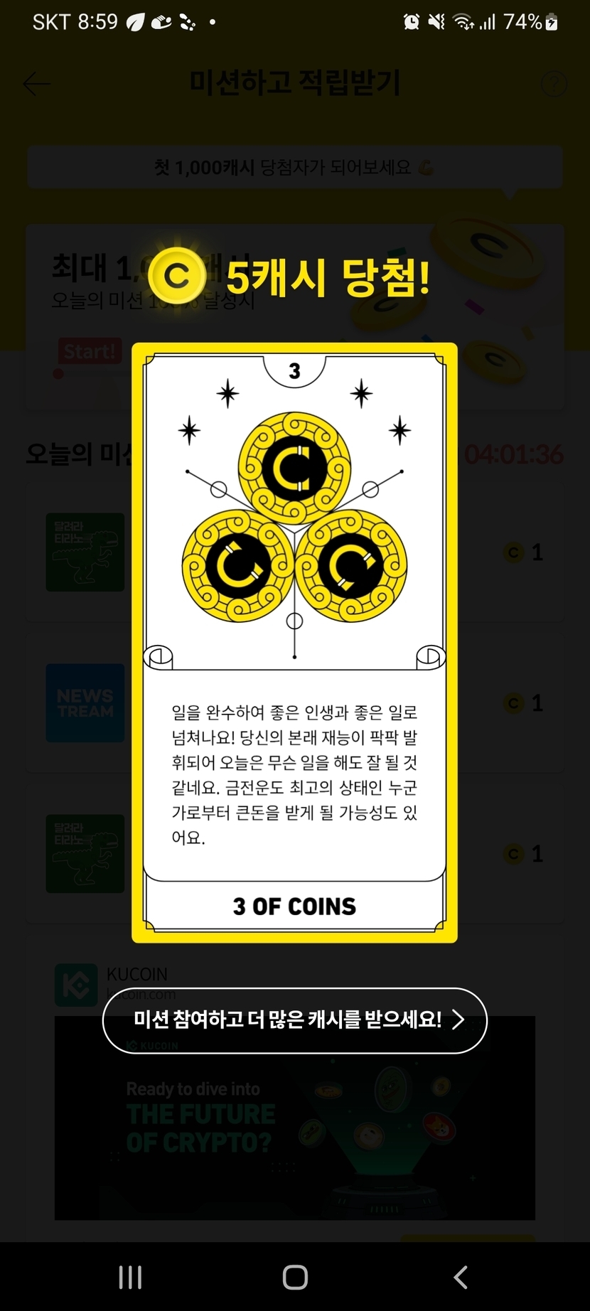 24.09.09 126 읽음 랜덤캐시,미션보드 미션완료!! swsion1078(답방) 구독하기 40 37 콘텐츠의 수익 4 9월9일 랜덤캐시 미션완료 7캐시, 미션보드 미션완료 4캐시, 타로카드는 5캐시, 비디오시청은 1캐시 받았어요. 37 0 / 300 입력