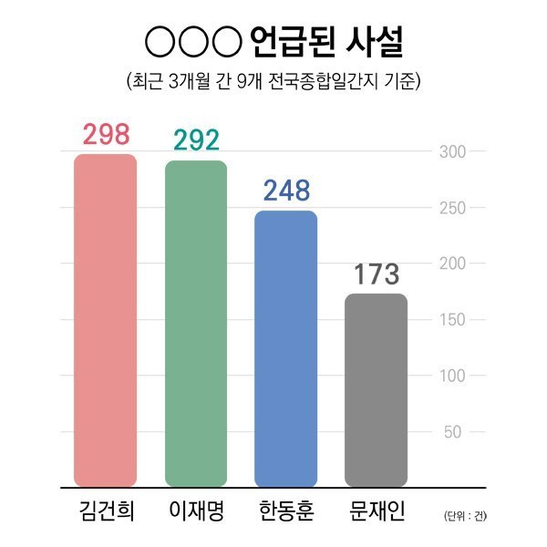한국언론진흥재단이 운영하는 뉴스 분석 시스템 ‘빅카인즈’를 통해 9개 종합일간지(경향신문, 국민일보, 동아일보, 서울신문, 세계일보, 조선일보, 중앙일보, 한겨레, 한국일보)를 확인한 결과 6월26일부터 9월26일까지 3개월간 ‘김건희’ 키워드가 포함된 사설은 모두 298건으로 나타났다. 같은 기간 ‘이재명’ 키워드가 포함된 사설은 292건, ‘한동훈’ 키워드가 포함된 사설은 248건이었다. ‘문재인’ 키워드는 173건, ‘윤석열’ 키워드는 733건이었다.