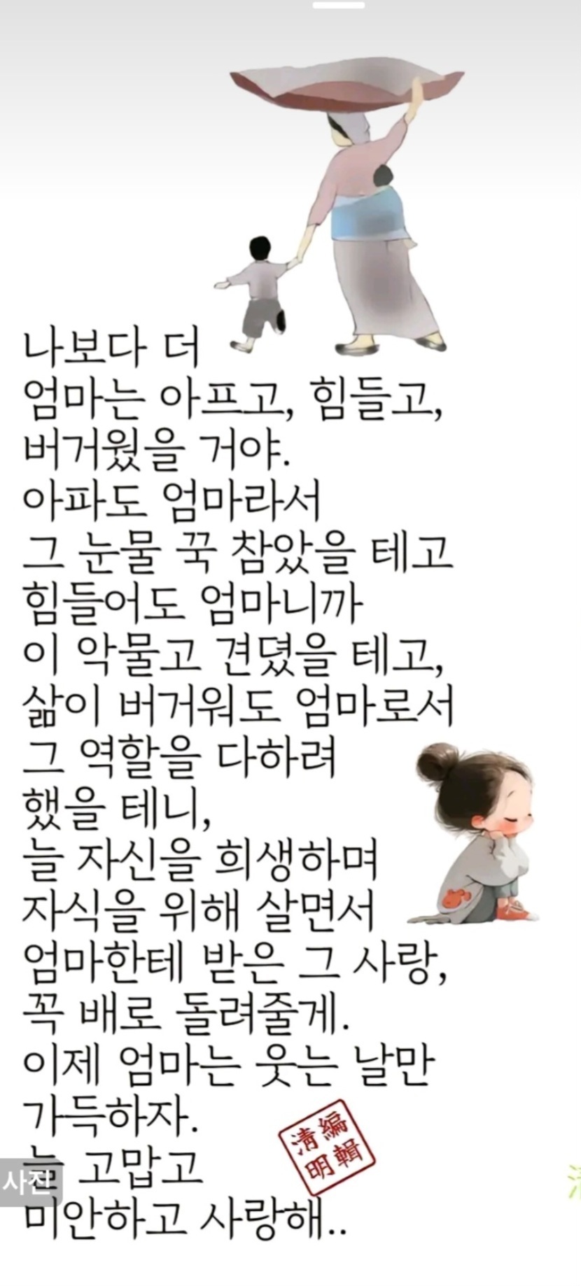 24.09.30 120 읽음 엄마라는 존재 딸셋 아들 하나 엄마 구독하기 6 14 콘텐츠의 수익 8 엄마가 생각나네여 돌아가신지 오래 돼서 22살에 하늘에 올라 가시고 이제 42이네여 잊혀진줄 알았는데 마음 한구석에 남아있네여 돌아가실때 나이가 42 젋은 나이에 가셨는데 이제 4자녀 엄마가 되고 같은 나이가 됐네여 14 0 / 300 입력