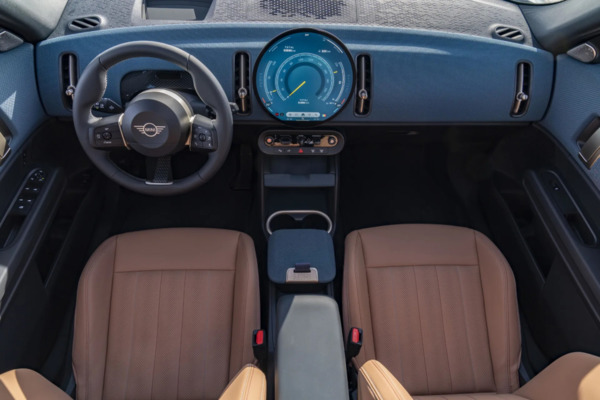 2025 컨트리맨의 실내는 전통적인 계기판 대신 9.4인치 원형 인포테인먼트 스크린을 중심으로 한 디자인이 돋보입니다. 중요한 운전 정보를 이 화면을 통해 제공하며, 헤드업 디스플레이를 선택하면 운전 시 시야 정면에서 운전 정보를 확인할 수 있습니다.