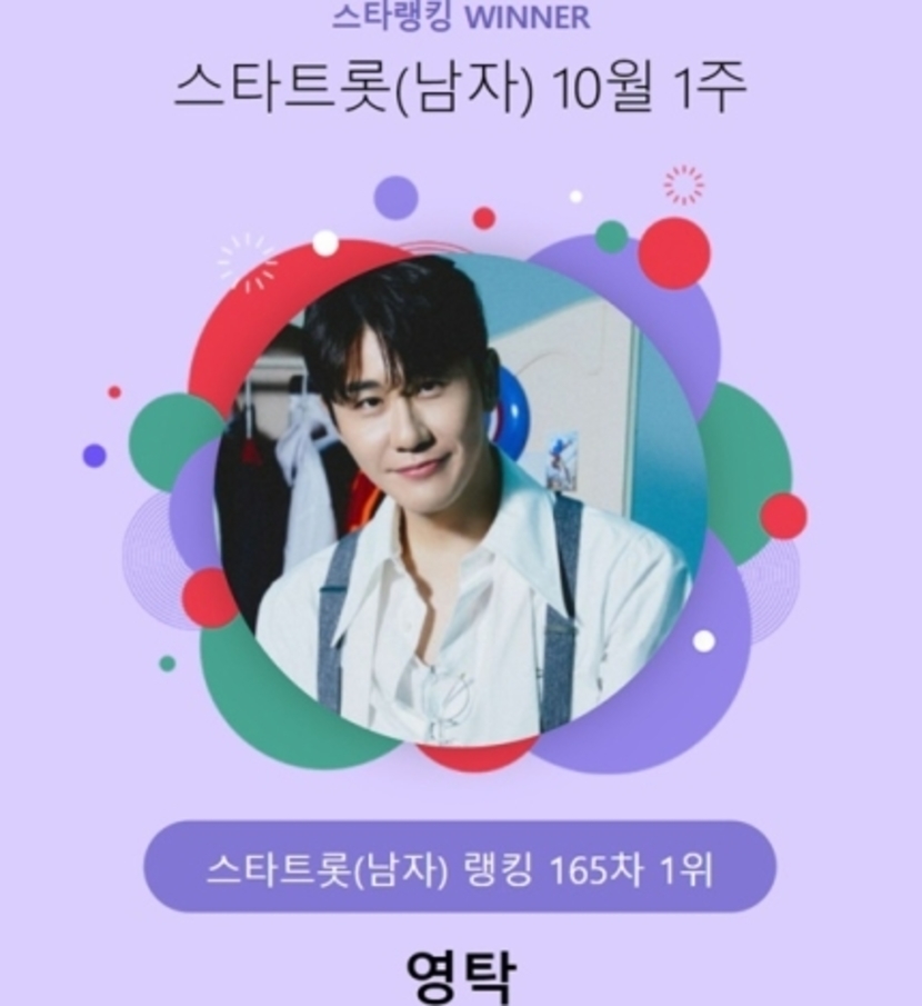 영탁은 3일 오후 3시 1분부터 10일 오후 3시까지 진행된 10월 1주(165차) 스타랭킹 스타트롯 남자 랭킹에서 9만 1079표로 1위에 이름을 올렸다.