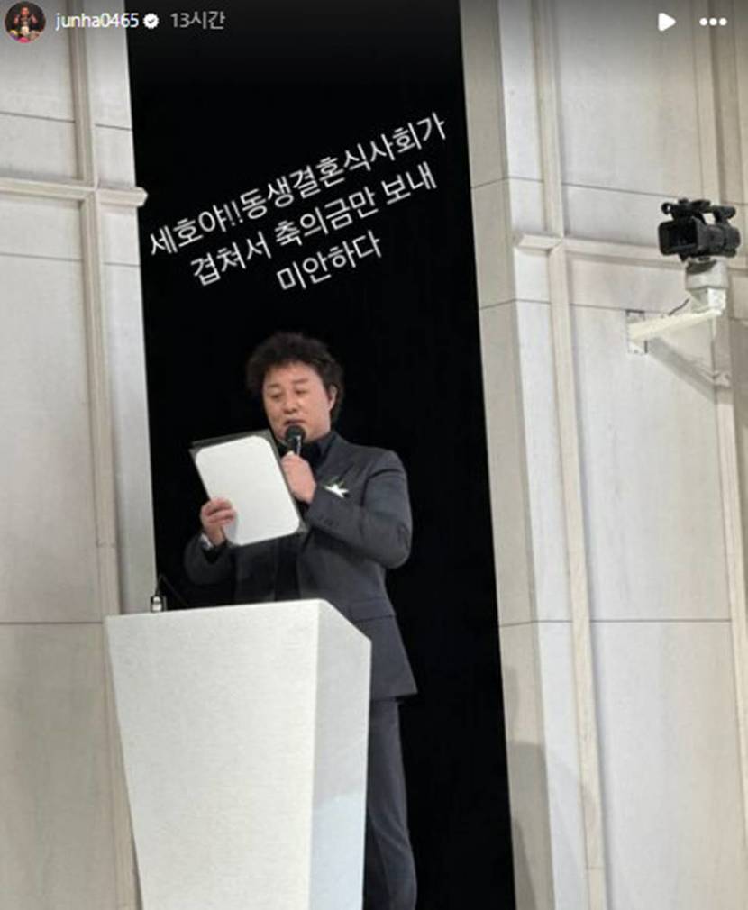 다만 이날 정준하는 불참했다. 같은 날, 정준하는 개인 소셜 미디어 계정에 “세호야! 동생 결혼식 사회가 겹쳐서 축의금만 보내 미안하다”라는 말과 함께 사진 한 장을 게재했다.