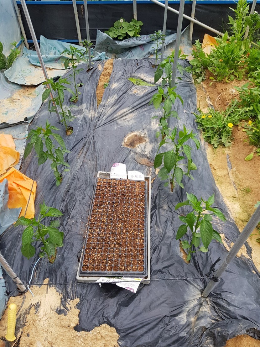 남편은 힘들다고 들어가서 쉬고 나는 비닐 하우스에 있는 야채들이 시들까봐 호수로 물을 주었습니다.