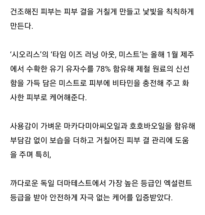 바쁜 일상 속에서 많은 시간을 투자해 따로 관리하기 어렵다면 언제 어디서든 간편하게 케어가 가능한 미스트를 추천한다. 다양한 피부 고민에 맞게 선택해 뿌려주기만 하자.