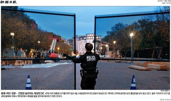 조선일보도 4면 「전례 없는 가짜뉴스 범람… 폭동 우려에 백악관·의사당은 펜스 봉쇄」에서 “선거 하루 전인 4일에도 X(옛 트위터)에서 CNN 뉴스 형식으로 ‘해리스가 텍사스에서 트럼프에게 앞선다’고 적은 가짜 이미지가 퍼져 1000만회 넘는 조회 수를 기록했다”며 “대선이 시작되기도 전에 극단 분자들이 선거 후 폭동을 모의한 정황도 나왔다”고 했다.