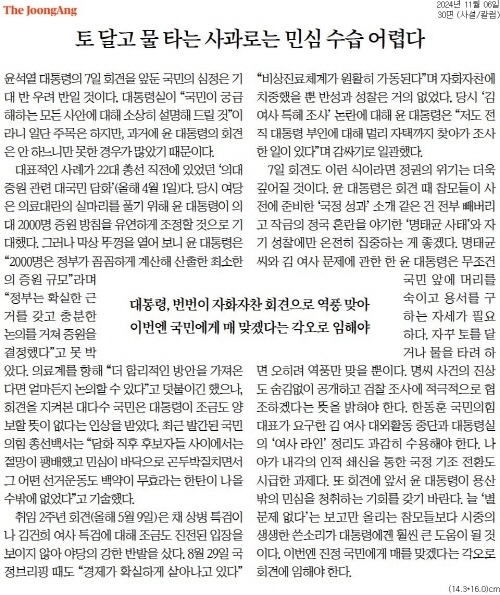 ‘명운’ 걸린 尹 회견… 중앙일보 “무조건 머리 숙이고 용서 구해야”