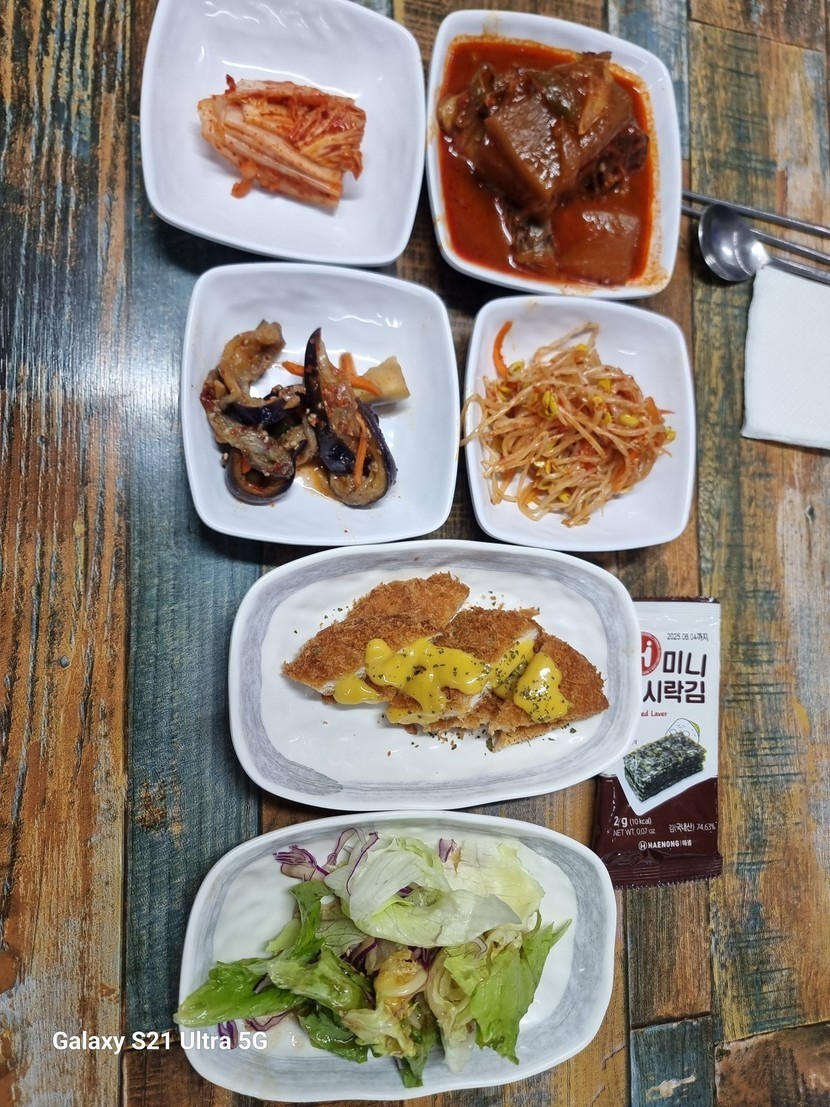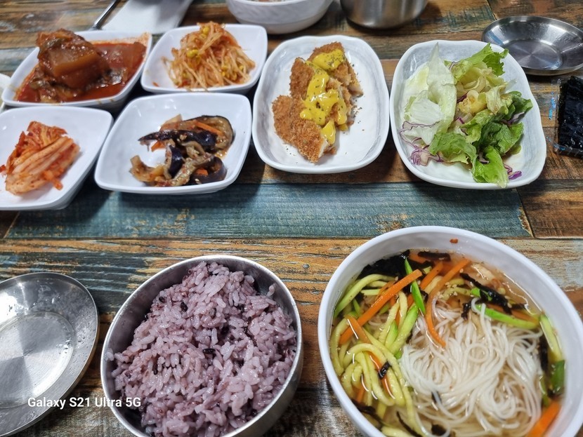 24.11.07 115 읽음 오늘 점심 💗베로니카 구독하기 3 4 콘텐츠의 수익 3 점심은 고민 할 필요없는 밥집으로 갔어요.여기는 따로 메뉴가 없고 그날의 국과 반찬이 있는 밥집이예요.밥, 잔치국수, 돈가스, 샐러드, 가지나물, 콩나물, 김치, 코다리조림, 양배추쌈으로 근사하게 나왔어요.저는 샐러드 공략하고 잔치국수부터 먹었어요.같이 간 친구는 가지나물 맛있다며 가지와 양배추를 공략하더라구요.맛있게 점심을 먹었네요.요즘 환절기 감기로 고생하시는 분들 많이 계시더라구요.추운 날씨에 건강 잘 챙기세요. 4 0 / 300 입력