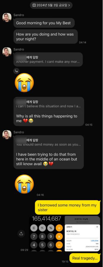 한 40세 여성 피해자는 해외에서 근무하는 선박 조향사를 사칭한 일당의 "짐을 보낼 테니 통관비를 대신 내주면 갚겠다"는 말에 속아 1억3000만원에 달하는 대출까지 받아 총 1억6500만원을 넘긴 것으로 조사됐다.