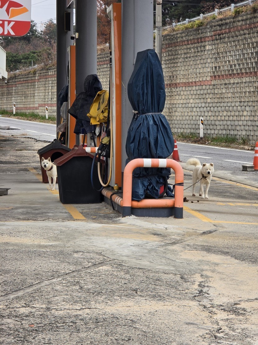영업 종료한 주유소 지키는 댕댕이들