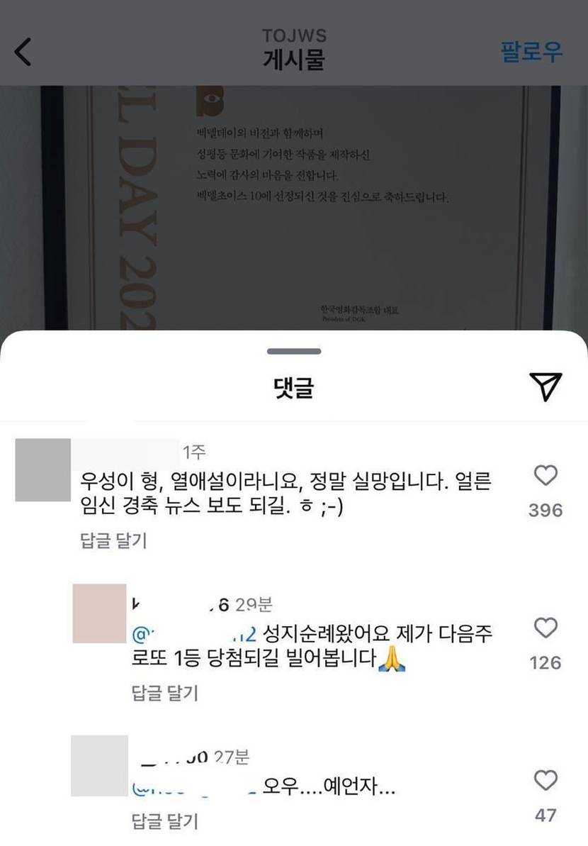 “우성이 형, 얼른 임신 경축 보도되길 ㅎ” 현재 급속 확산 중인 '댓글' 하나