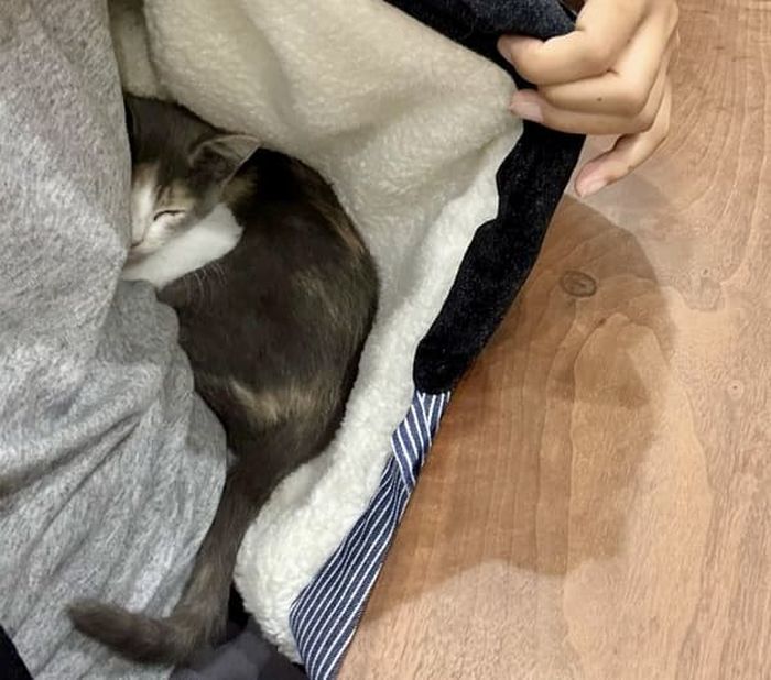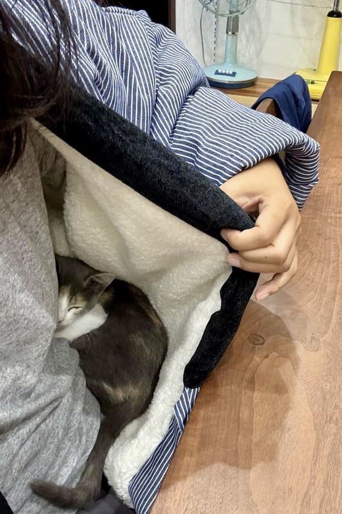 공개된 사진 속에는 아기 고양이가 외투 사이로 쏙 들어와서는 세상 따뜻하고 편안한 듯 자리잡고 앉아 나올 생각이 전혀 없는 모습이 담겨 있었죠.