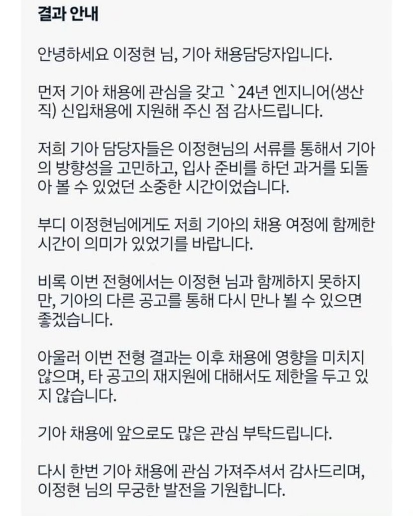 기아 채용 담당자는 이정현에게 1차 탈락을 알리며 “저희 기아 담당자들은 이정현 님의 서류를 통해 기아의 방향성을 고민하고 입사 준비를 하던 과거를 되돌아볼 수 있었던 소중한 시간이었다”며 “부디 이정현 님에게도 저희 기아의 채용 여정에 함께한 시간이 의미가 있었기를 바란다”고 밝혔다.