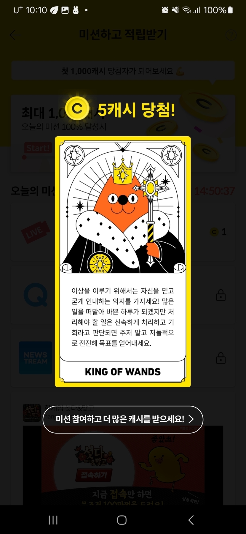 24.12.28 130 읽음 랜덤캐시,미션보드 미션완료!! swsion1078(답방) 구독하기 22 22 콘텐츠의 수익 2 12월28일 랜덤캐시 미션완료 9캐시, 미션보드 미션완료 6캐시, 타로카드는 5캐시, 비디오시청은 4캐시 받았어요. 22 0 / 300 입력