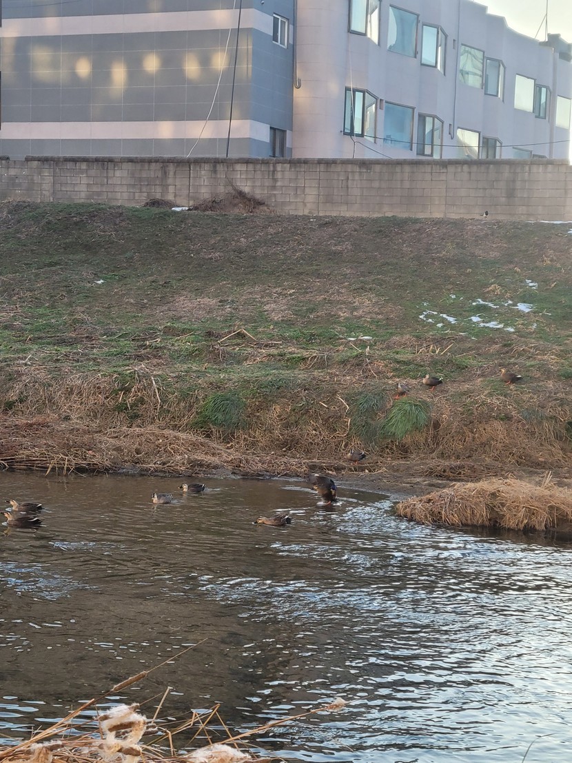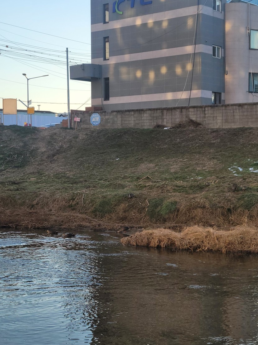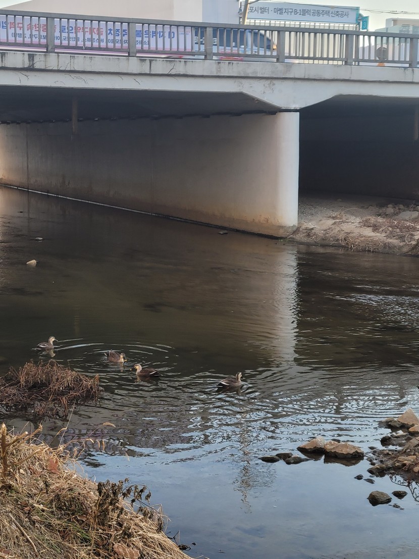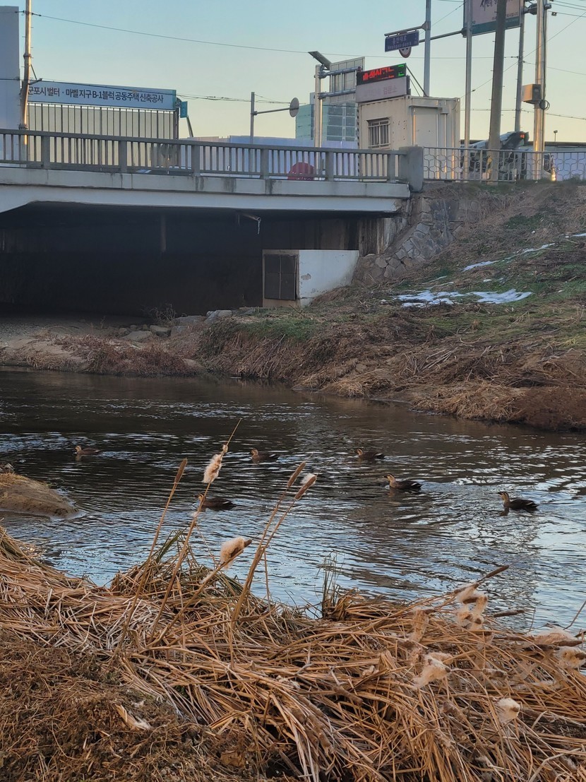 천변에 오리떼가 수십마리 군집을 이뤘네요