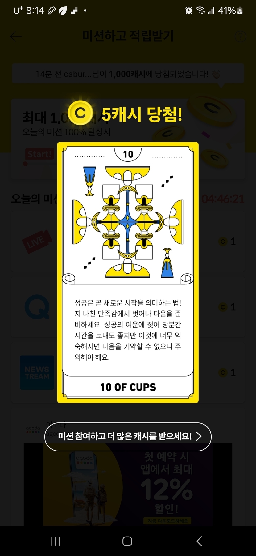25.01.02 116 읽음 랜덤캐시,미션보드 미션완료!! swsion1078(답방) 구독하기 32 30 콘텐츠의 수익 3 1월2일 랜덤캐시 미션완료 7캐시, 미션보드 미션완료 3캐시, 타로카드는 5캐시, 비디오시청은 4캐시 받았어요. 30 0 / 300 입력
