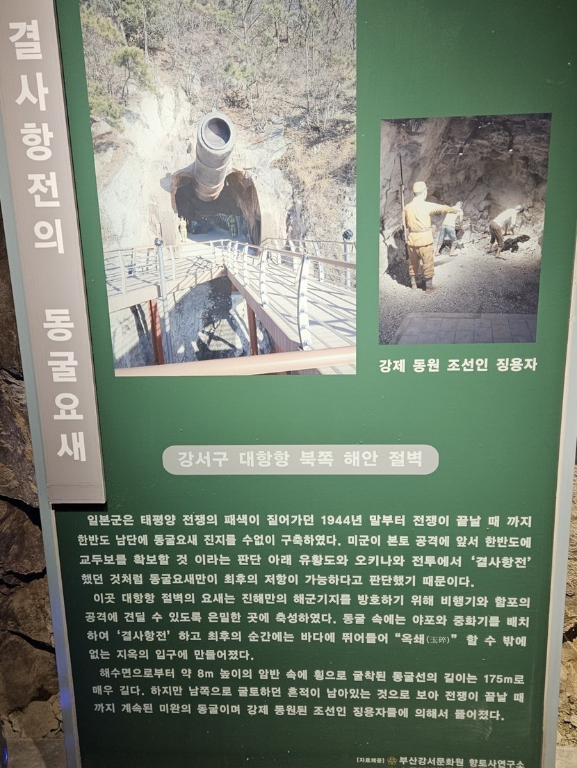 데크길을 만들어 관람 할 수 있게 됐더라구요ㆍ안에서 밖으로 본 첫번째 입구첫번째 포진지 내부내부에서 본 두번째 굴 입구인데 이건 첫번째 굴과 연결되어 있습니다ㆍ 세번째 굴인데 첫번째와 두번째와 연결 되어있고 출구라고 보면 되겠네요 네번째 굴 입구 첫번째 두번째 굴 보다 훨씬 짧고 출구는 따로 없어요ㆍ 다섯번째 굴 이또한 출구가 따로 없고 아주 짧습니다ㆍ 소원글을 적은 쪽지들이 커텐처럼 드리워져 있군요 ㆍ 대동아 전쟁시 미군이 한국을 칠것으로 예상하고 구축한 포진지인데 해안 절벽에 지어서 좋은말로 결사항쟁이지만 가미카제 처럼 후퇴 할 수 없는 위치입니다ㆍ 대항에서 한고개 돌아가면 외양포에 일본군 사령포대진지 요새 자리가 있습니다ㆍ