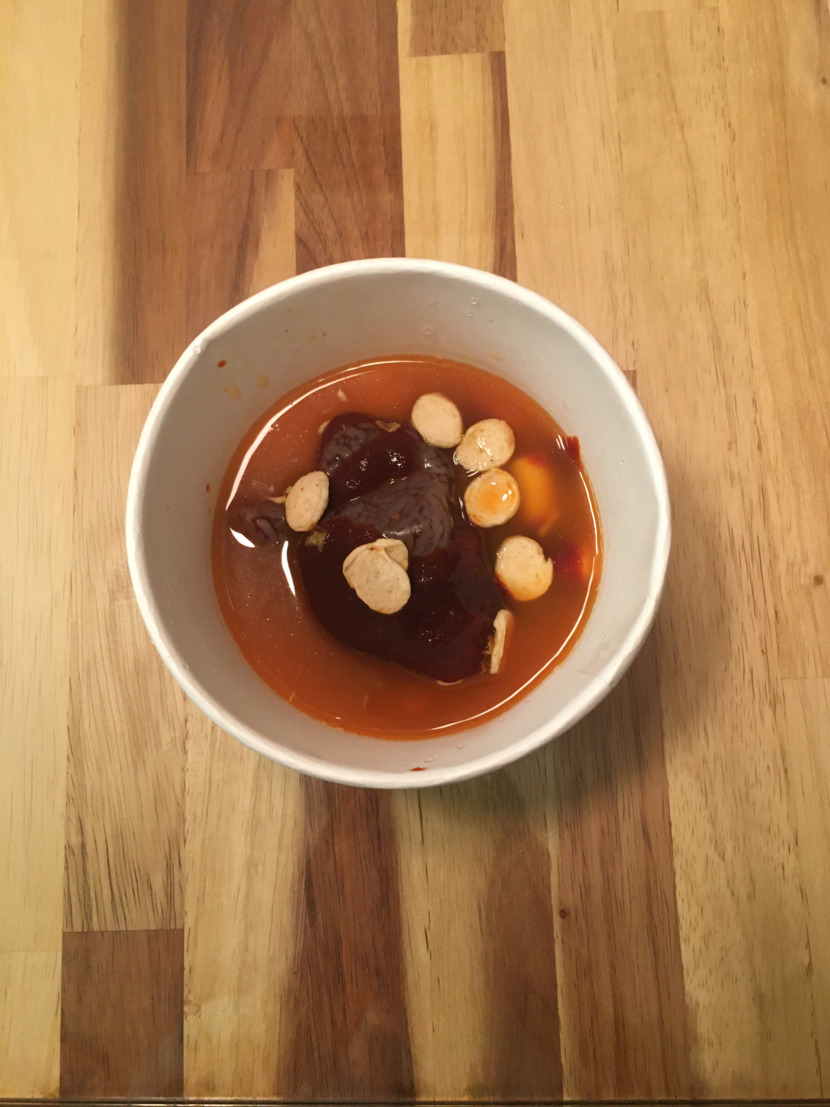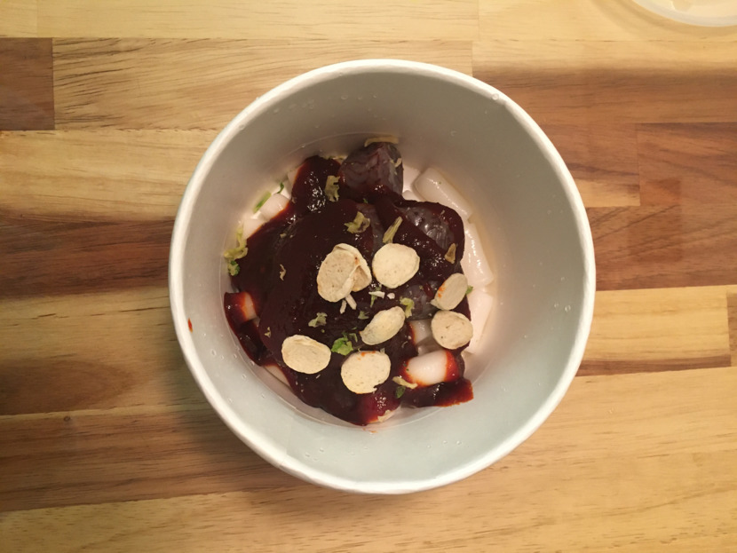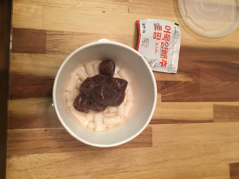 이 떡볶이는 특이하게 순대가 들어 있어요.