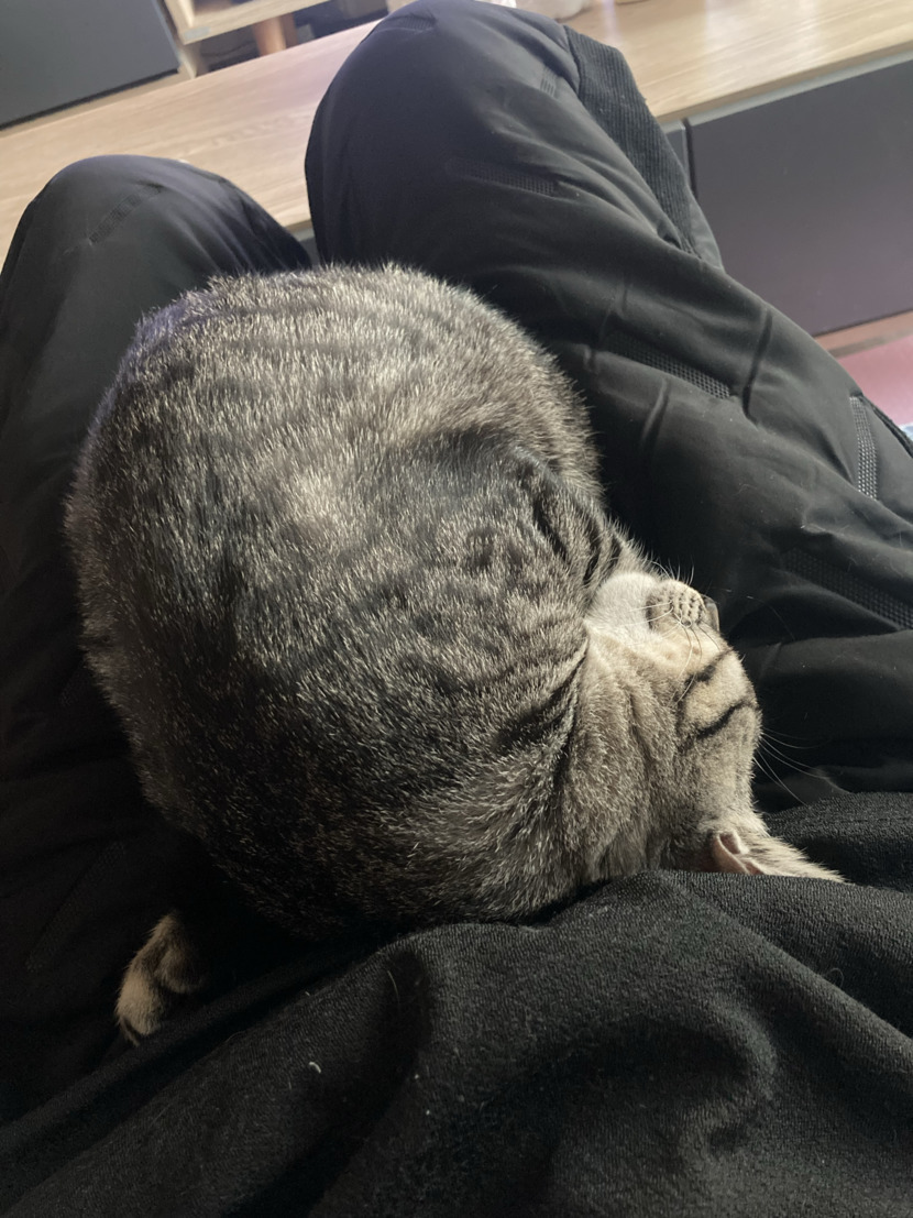 집사 무릎위에서 그루밍하다 뻗은 콩이