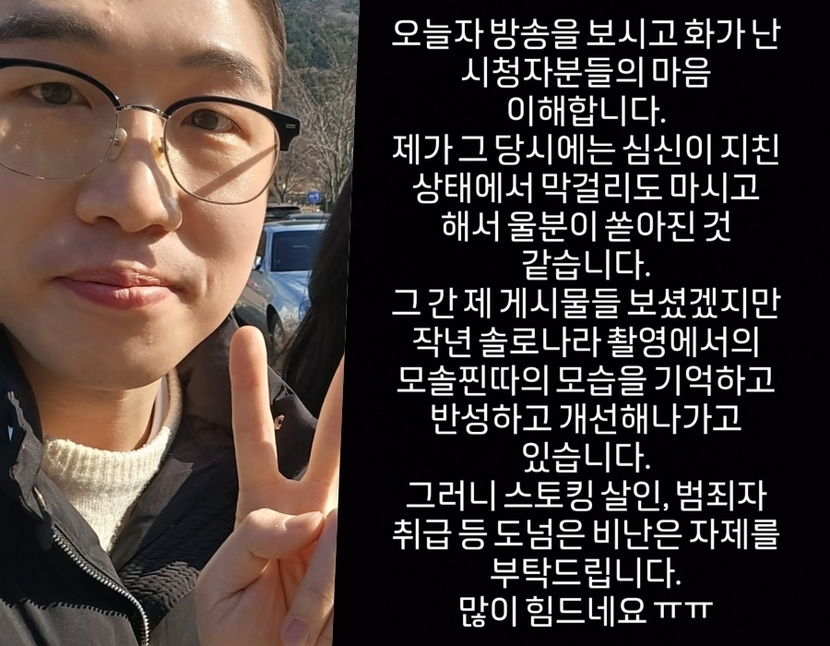 이어 "그간 제 게시물들 보셨겠지만, 작년 솔로나라 촬영에서의 모솔찐따의 모습을 기억하고, 반성하고, 개선해나가고 있습니다. 그러니 스토킹 살인, 범죄자 취급 등 도넘은 비난은 자제를 부탁드립니다. 많이 힘드네요"라고 고통을 호소했다.