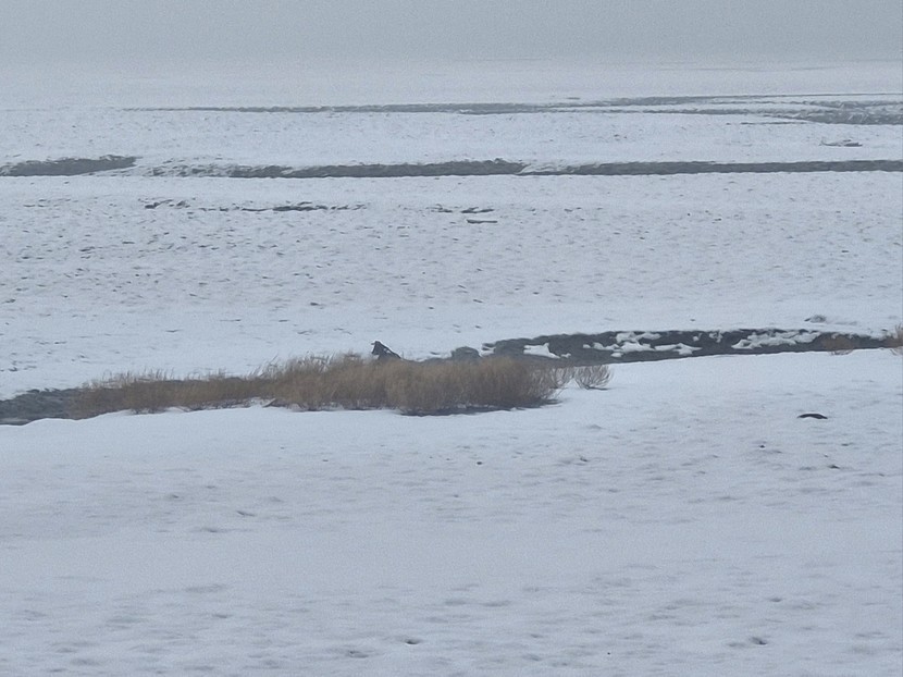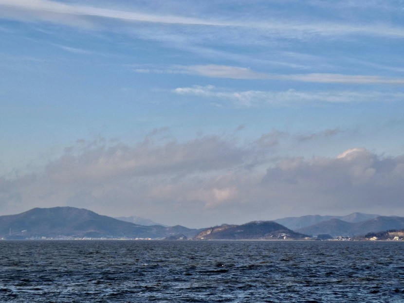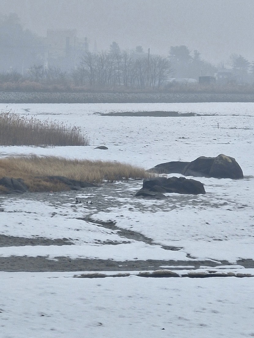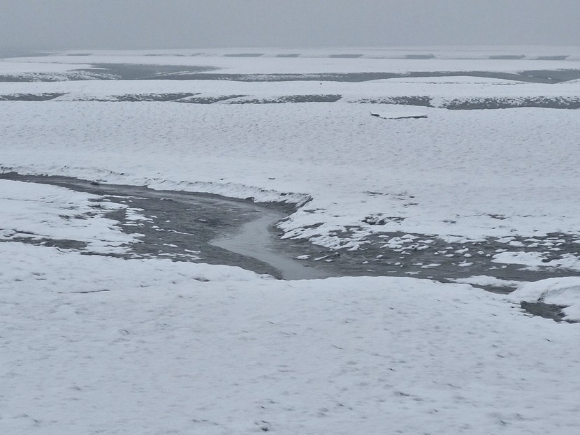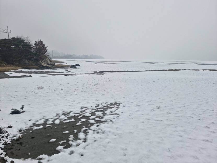 강화 바다 물 빠진 뻘 위에 눈이 쌓였어요.