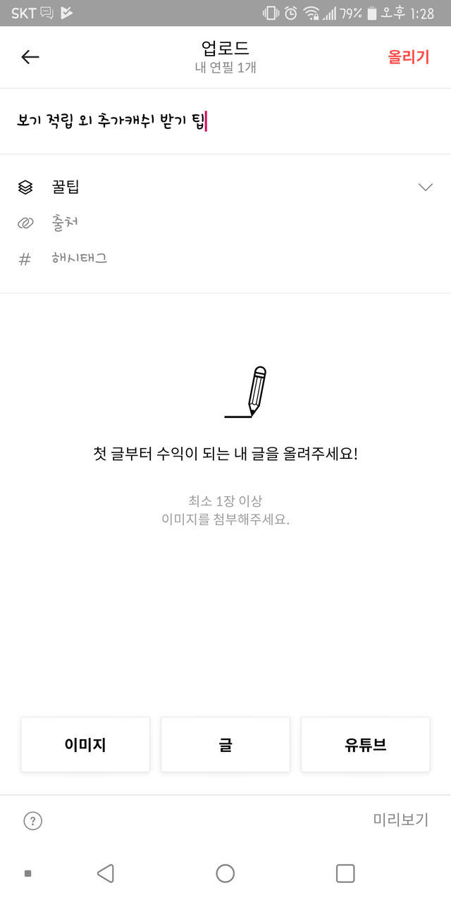 19.11.14 106 읽음 보기 적립 외 추가캐쉬 받기 팁 파워드랍킥 구독하기 3 5 콘텐츠의 수익 32 1. 최초 글쓰기시 휴대폰 인증2.연필이 있어야 글을 쓸 수 있는데 연필은 출첵이나 일일미션(댓글이나 캐시피드 보기 등) 으로 하루 최대2개 가능3.유용한 글이나 꿀글 올리고 조회수나 댓글 많이 달릴 수록 캐쉬 누적 적립 5 0 / 300 입력