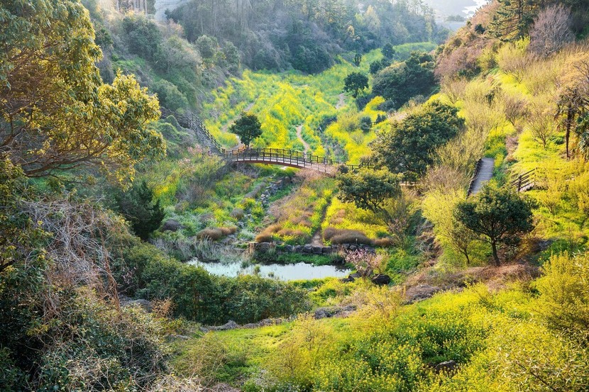 봄이면 엉덩물 계곡 경사면을 따라 나무 데크길 사이로 유채꽃이 만발하여 유채꽃 명소로도 상당히 아름답
