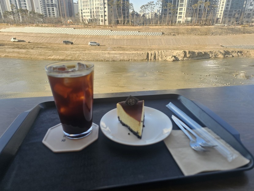 아메리카노와 치즈 케이크 먹으며
