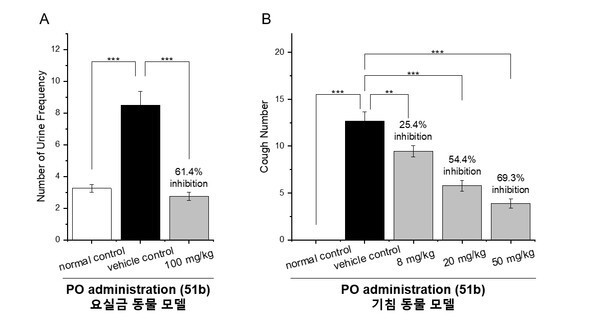 51b를 요실금 모델에 100 mg/kg 용량으로 경구 투여했을 때 요 빈도가 61.4% 감소했으며, 기침 모델에서는 20 mg/kg 용량 투여 시 기침 횟수가 54.4% 줄었다.