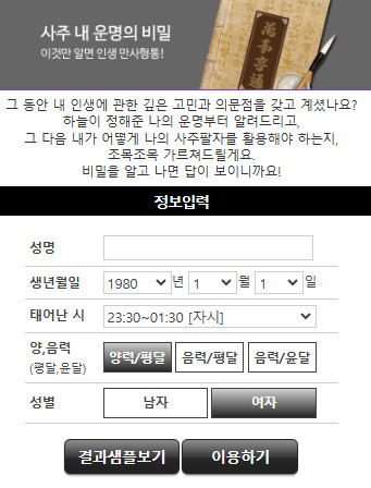 이는 바로 온라인 전문 사이트 '위키사주'로 유저가 이름, 생년월일, 태어난 시간, 성별을 입력하면 각각의 서비스에 따라 자신의 사주 정보를 상세히 알려준다.사주풀이를 절대적으로 믿고 의존해서는 안 되지만, 우리의 궁금증을 해소시키는 정보로 활용할 수 있다. 오늘날에는 복잡한 점술도구를 찾아다니거나 전문가를 찾아가지 않아도 인터넷을 통해 쉽게 사주풀이를 받아볼 수 있다. 온라인 사주 전문 사이트 '위키사주'는 오랜 전통을 바탕으로 한 사주팔자와 현대적인 분석 기술을 결합하여 각자의 운명을 상세히 분석한다.