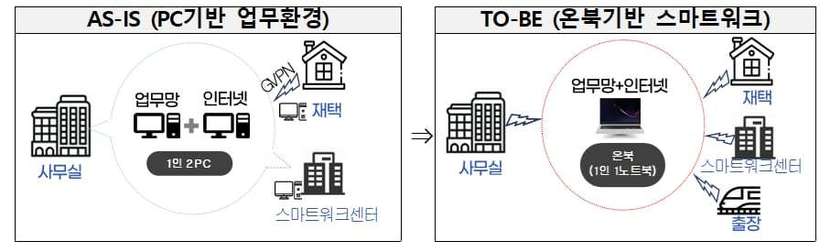 국가정보원의 ‘물리적 망분리’ 원칙에 따라 공무원들은 사무실에서 1인당 2대의 데스크톱을 사용 중이다. 물리적 망분리 원칙은 국가 기밀정보 유출 등 보안사고를 막기 위해 내부 업무망과 외부 인터넷망을 완전히 분리하는 것을 말한다. 스마트폰이나 개인 노트북으로 정부 업무망에 접근할 수 없어 공무원들은 무조건 청사 사무실에서만 업무를 볼 수 있었다.
