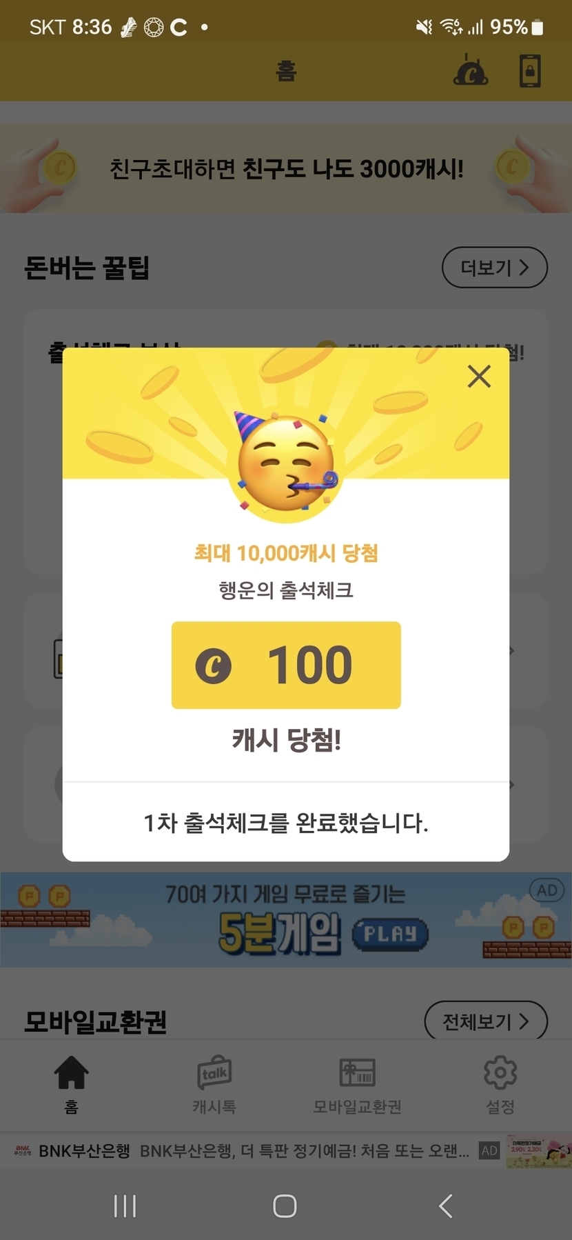 오늘 천보걷고 출석체크에서100캐시 기분좋네요
