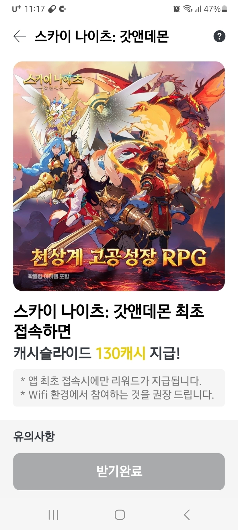 스카이 나이츠 앱 최초 접속하고 130캐시