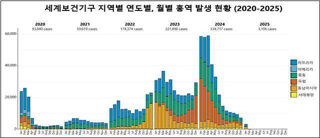 세계보건기구(WHO) 자료에 따르면 전세계적으로 홍역이 유행중으로, 2024년 홍역환자 수는 약 33만 명이며(’25.2.11. 기준) 유럽, 중동, 아프리카 순으로 많고, 우리나라 사람들이 많이 여행하는 동남아시아, 서태평양지역에서도 많이 발생하고 있다.