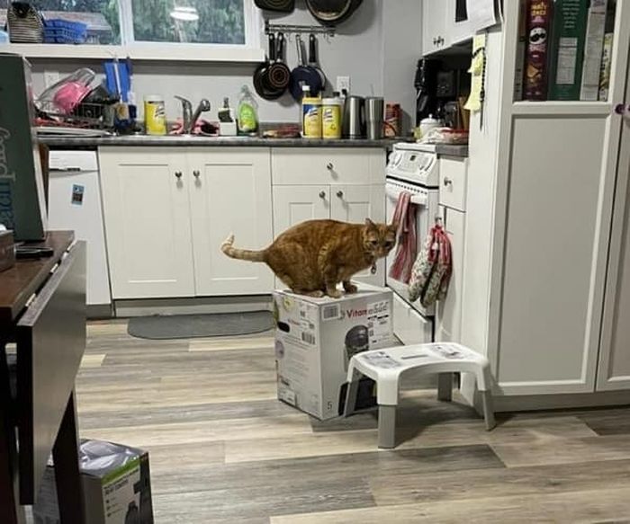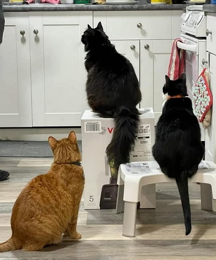 공개된 사진 속에는 고양이들이 마치 캣타워라도 되는 것 마냥 믹서기 상자 위에 올라가 자리잡고 앉아 있는 것이 아니겠습니까.