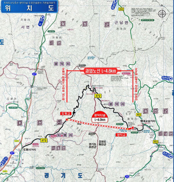 광덕터널은 화천군 사내면에서 경기도 포천시를 연결하는 유일한 관통 도로인 광덕고개에 설치하게 된다.