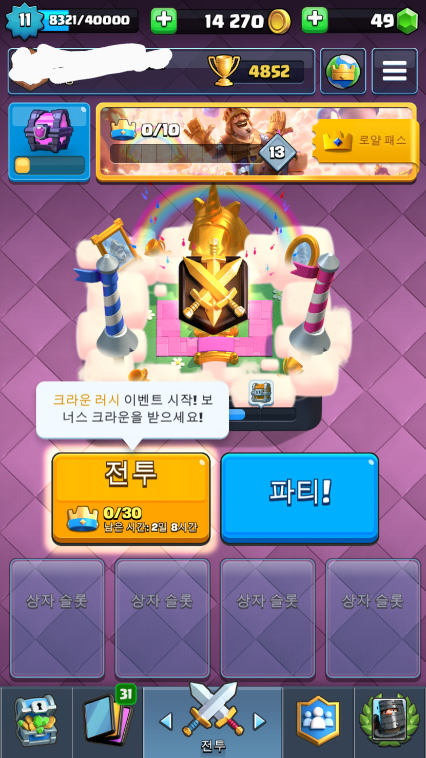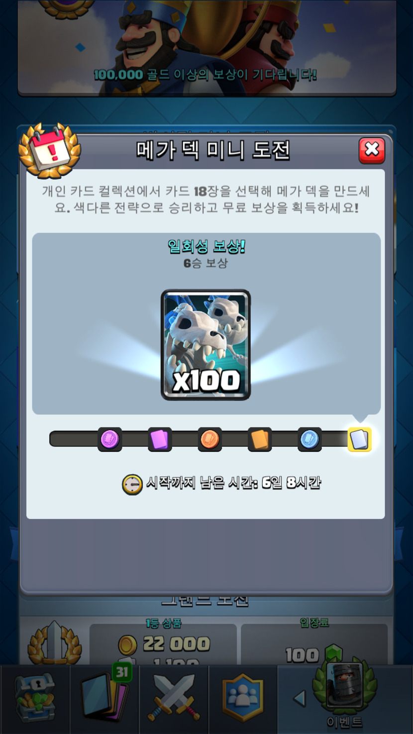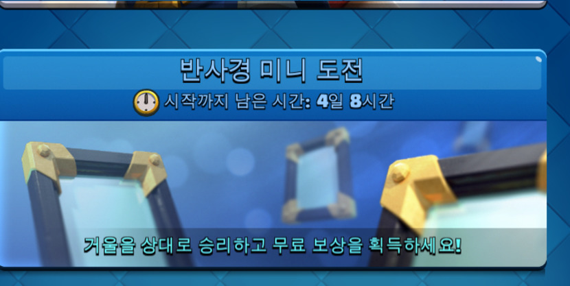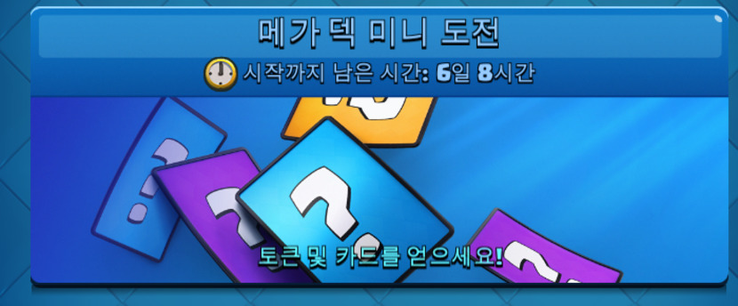 오늘은 예정인 반사경 미니 도전과 메가덱 미니 도전을 소개 하겠습니다.반사경 미니 도전은 반사경이 들어간게 아닌 그냥 상대와 같 은 덱으로 전투하는 방식인데요, 저도 해보진 못해 정확히 어 떨진 잘 모릅니다.메가덱 미니 도전은 18개의 카드로 덱을 구성해 전투하는 방 식인데 메가 터치다운 같은 덱을 말합니다.지난번 해골 드레곤 드래프트에서 해골 드레곤을 못 얻어도 메가덱 미니 도전에서 다시 얻을 기회가 있으니 아쉬워하지 마세요!그리고 크라운 러쉬가 시작됬답니다.
