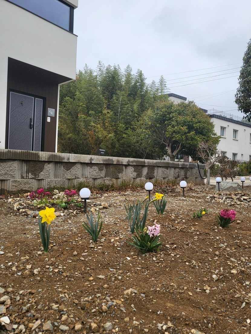 마당에 히야신스, 수선화가 피고 있어요
