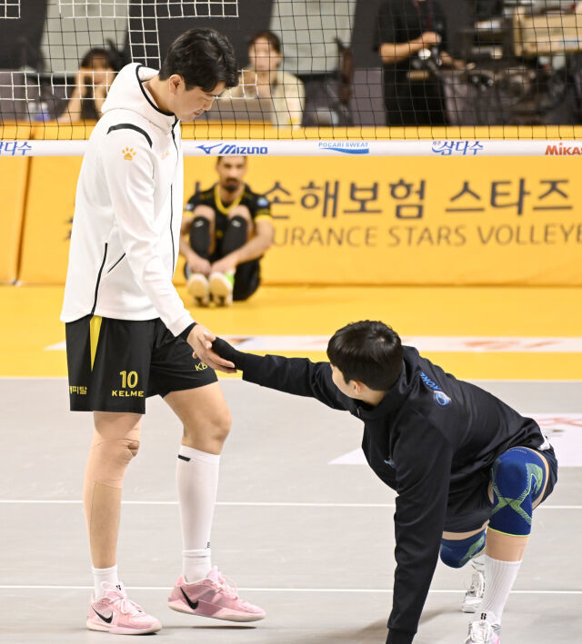이날 나경복은 경기전 훈련에서 재미 있는 모습을 선보였다. 대한항공 선수들의 훈련모습을 지켜보던 나경복은 평소 친분이 있던 곽승석에게 인사를 건넨뒤 몸을 풀고 있는 조재영에게 다가갔다. 조재영의 신발과 자신의 신발을 비교하며 핑크빛(?) 신발을 한껏 자랑했다. 조재영도 선배의 핑크빛 신발을 보며 함박 웃음을 지었다.