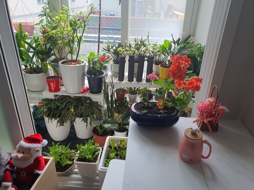 햇살받으며 베란다에서 잘 자라고 있는꽃들~어제 지인만나 감바스랑소시지구이