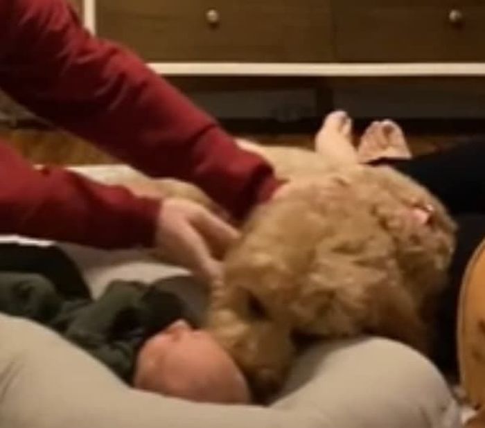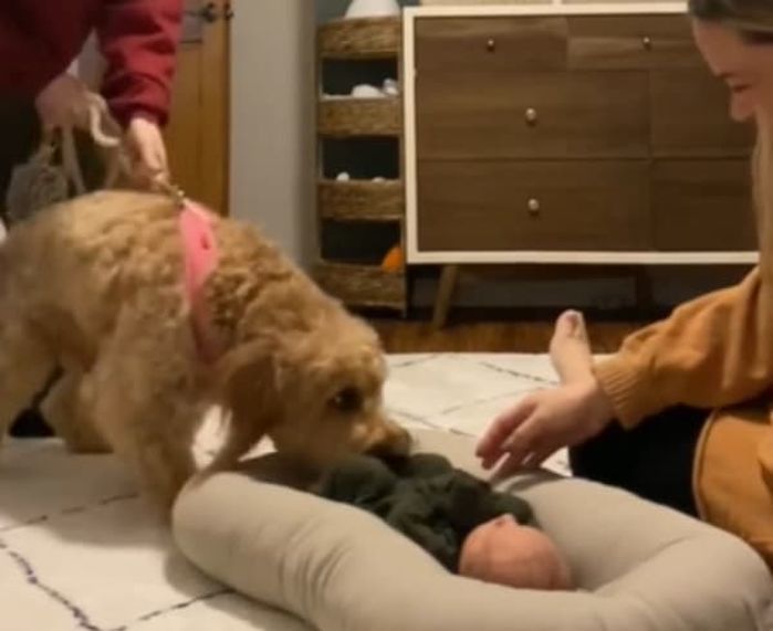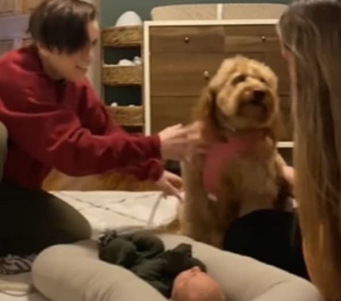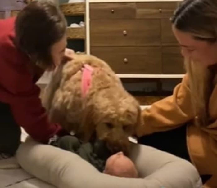 이날 태어난지 며칠 안된 아기가 집에 왔는데요. 가족들은 새 가족이 된 아기를 강아지에게도 소개 시켜주기로 합니다.