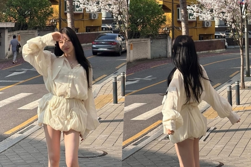 공개된 사진 속 이채연은 은은한 아이보리 컬러 셔츠 원피스를 입고 동네 산책을 하고 있는 모습이다. 벚꽃 앞에서 상큼한 미모를 뽐내고 있는 이채연은 특유의 늘씬한 각선미가 돋보이는 의상으로 눈길을 끌었다. 이채연의 뒤태가 담긴 사진에는 너무 짧은 의상 탓에 속옷이 살짝 드러난 모습으로 시선을 강탈했다.