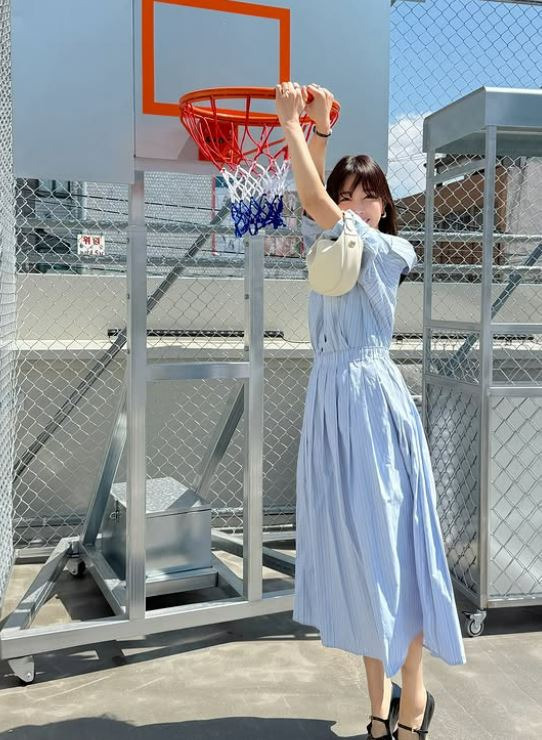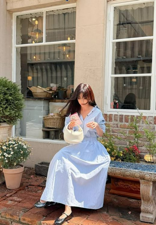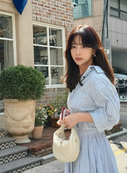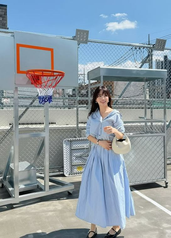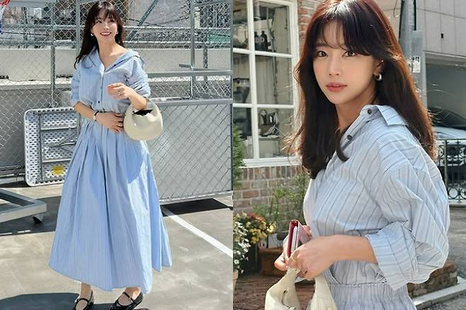 기은세는 하늘색 스트라이프 셔츠 원피스를 입고 웨이브 진 헤어 스타일로 사랑스럽고 청량한 분위기를 자아냈습니다.
