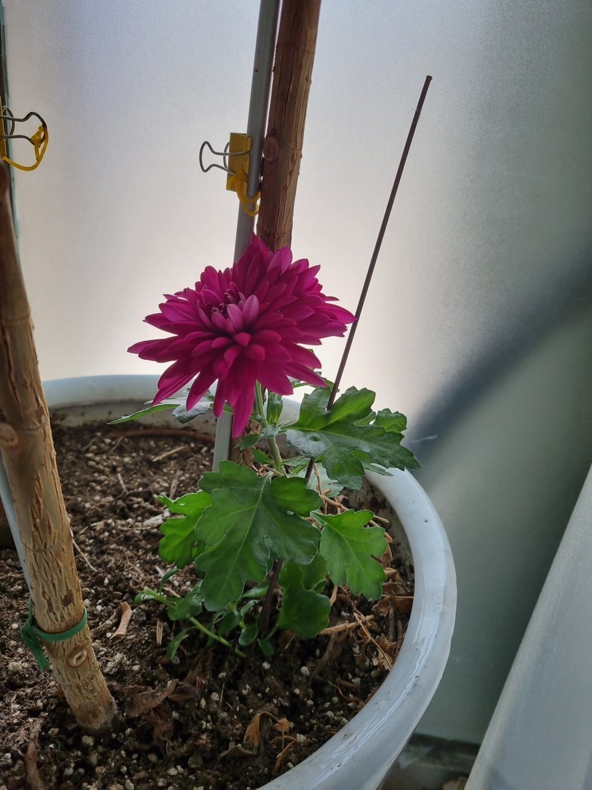 고목나무아래에서 활짝핀 국화꽃