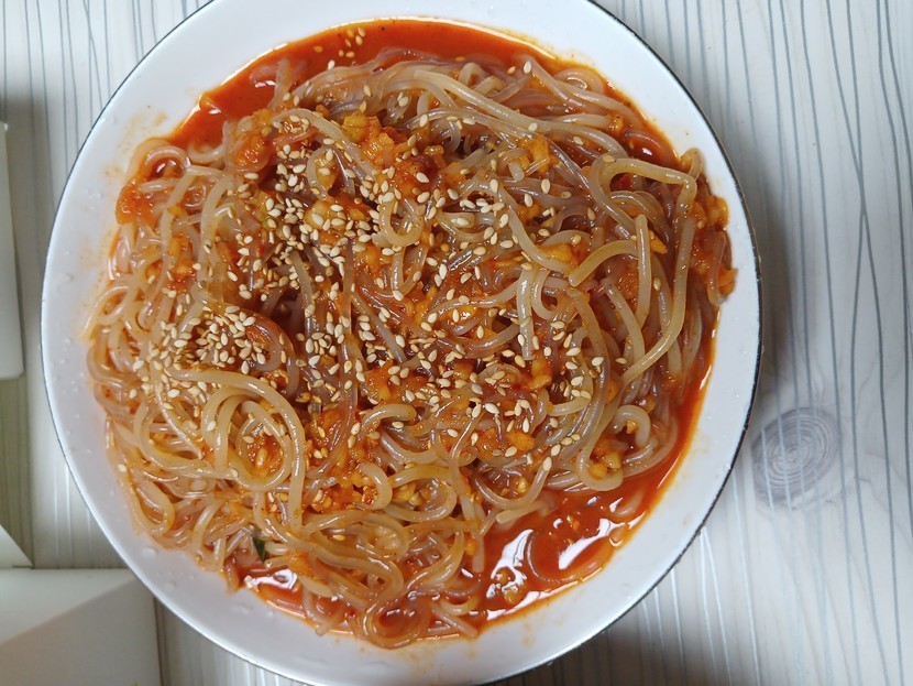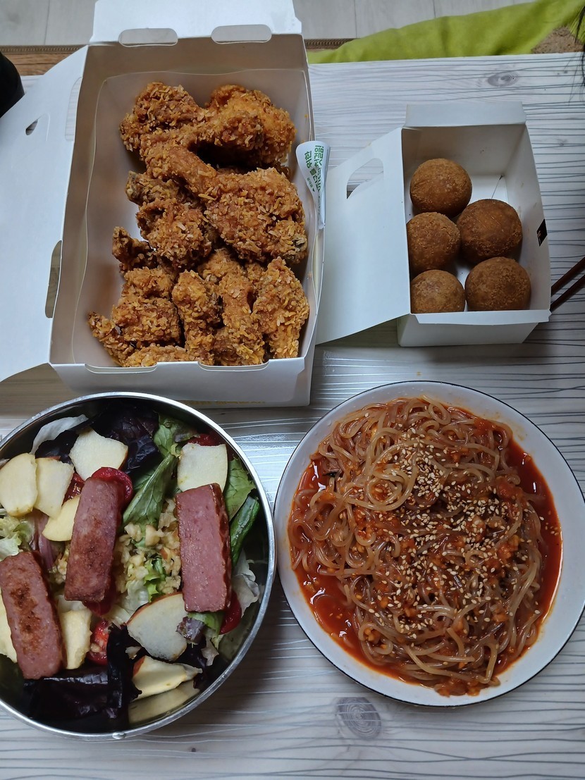 저녁은 치킨 쫄당면 무침 셀러드