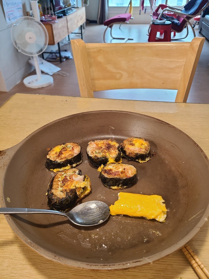 남은김밥을 계란물입혀서 다시 구워먹었어요 .버릴께없지요