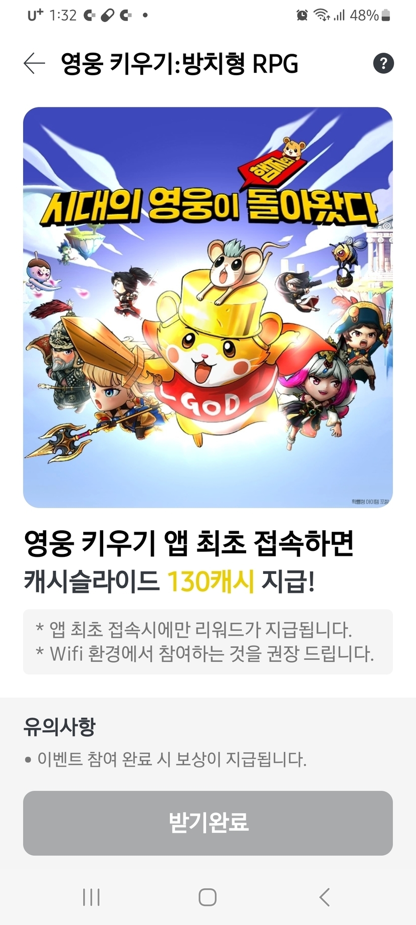 영웅키우기 앱 최초 접속하고 130캐시
