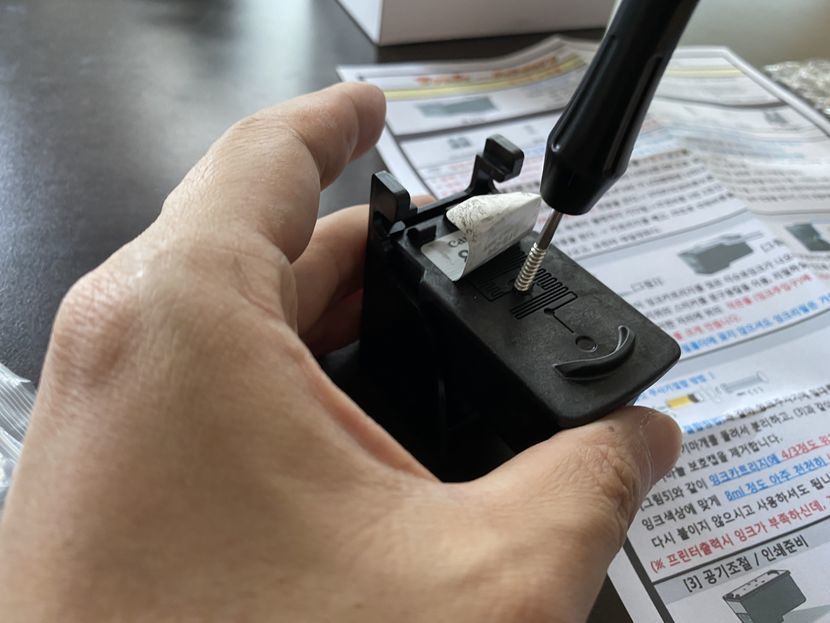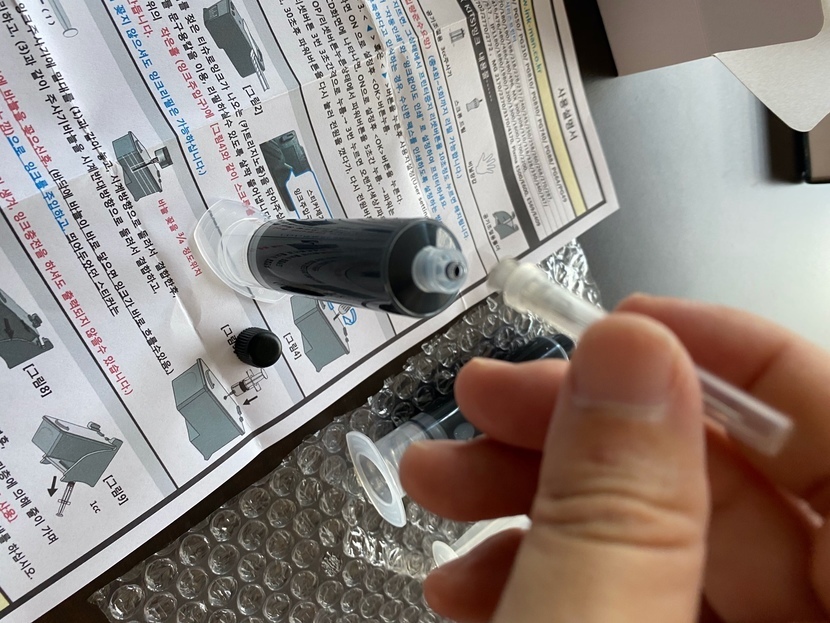 이 잉크주사기를 주사기 밀대와 연결해서 넣어주면 됩니다.