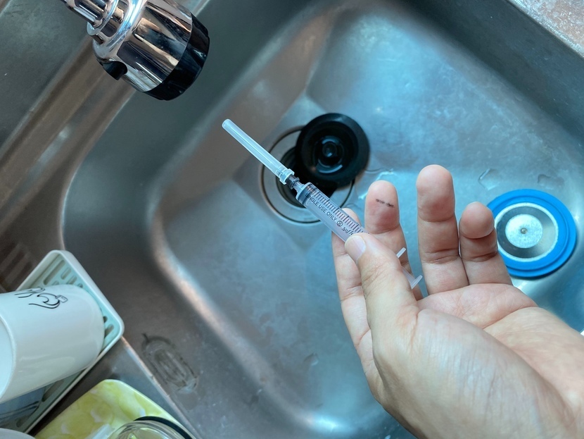 이제는 이 주사 바늘을 잉크가 들어있는 주사기에 연결합니다.